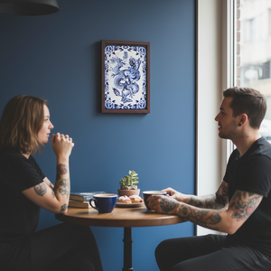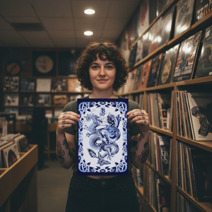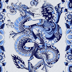 Aaron Hingston Blue Ryu a painting in blue that looks like a scene from a dream, a Chinese dragon and a woman who appears to be traveling through space and time on it...