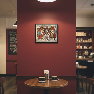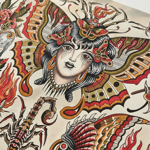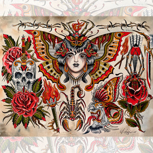 Aaron Hodges – Lady Death Flash blends macabre elegance and vintage Americana iconography—skulls, roses, torches, barbed wire, insects, and a central moth-woman figure—rendered with lush reds, antique golds, and deep blacks. The print retains the hand-painted texture and atmospheric aged background of the original artwork, bringing every line, gradient, and detail to life.