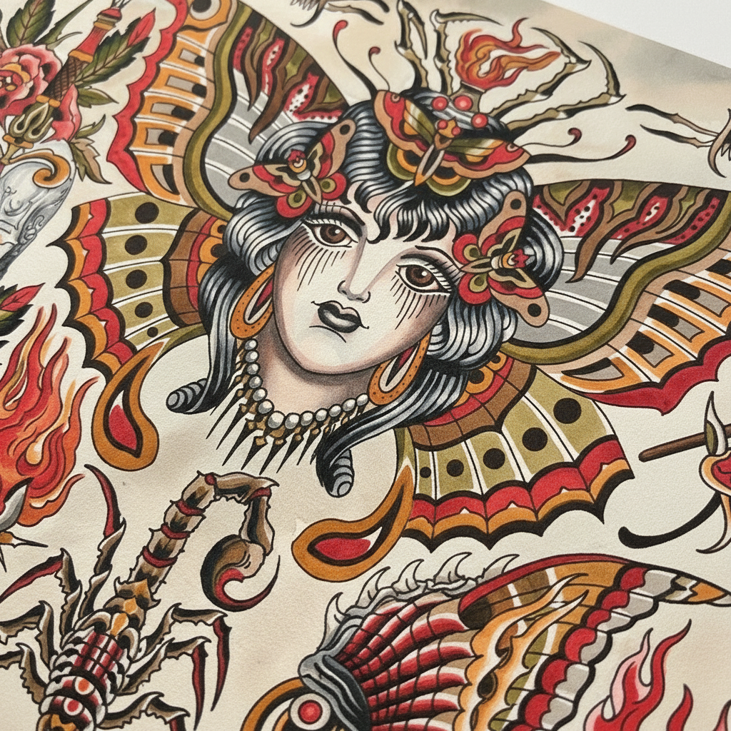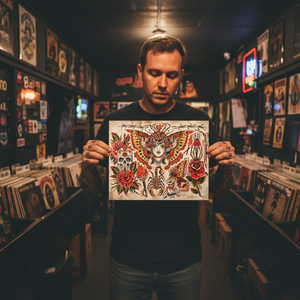 Printed in-house as a premium fine-art giclée using archival methods at Mindzai Creative on archival fine-art stock, this piece stands as both flash and fine art — a dramatic, romantic centerpiece for collectors and tattooers.