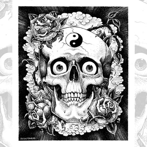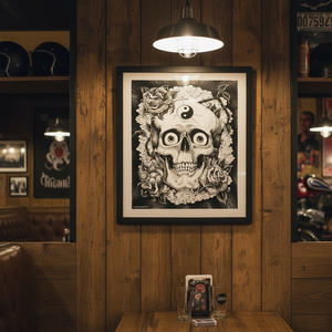 Black and white giclée print of Claudio Scialabba’s Teschio Ying Yang is produced using 300gsm Epson Cold Press fine-art paper, delivering a beautifully textured matte surface that enhances every tonal transition. The paper’s subtle grain adds depth and dimension to the monochrome artwork, giving it a refined, premium fine-art presence.