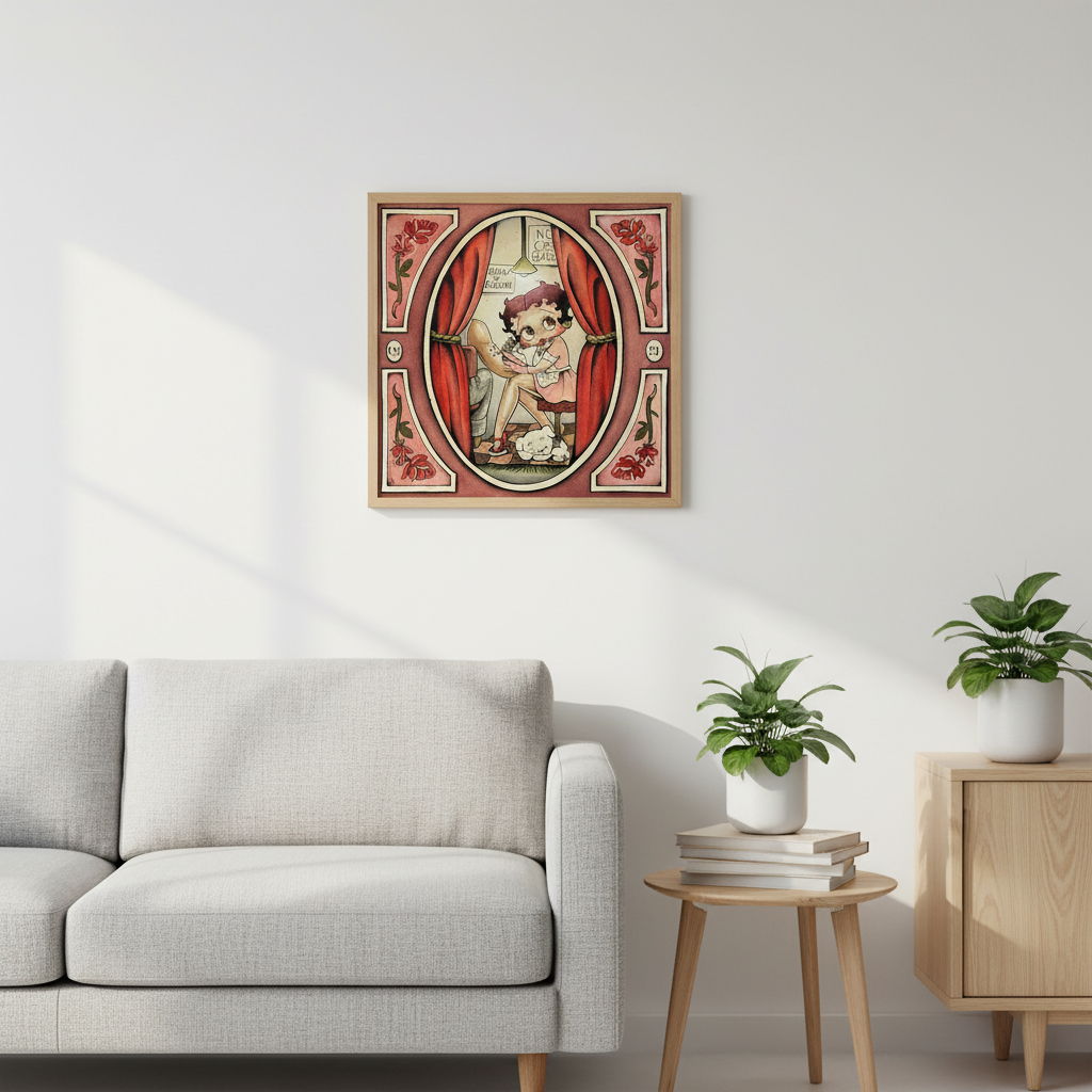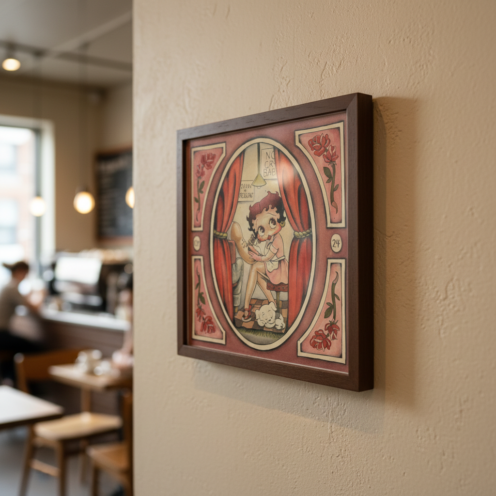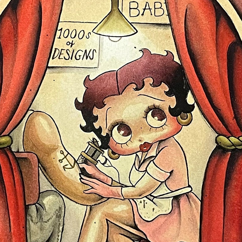 This charming Betty Boop watercolor-style print by Court Mello features a playful, vintage-inspired scene with classic cartoon character styling, soft shading, and nostalgic tattoo-shop details.