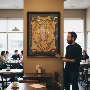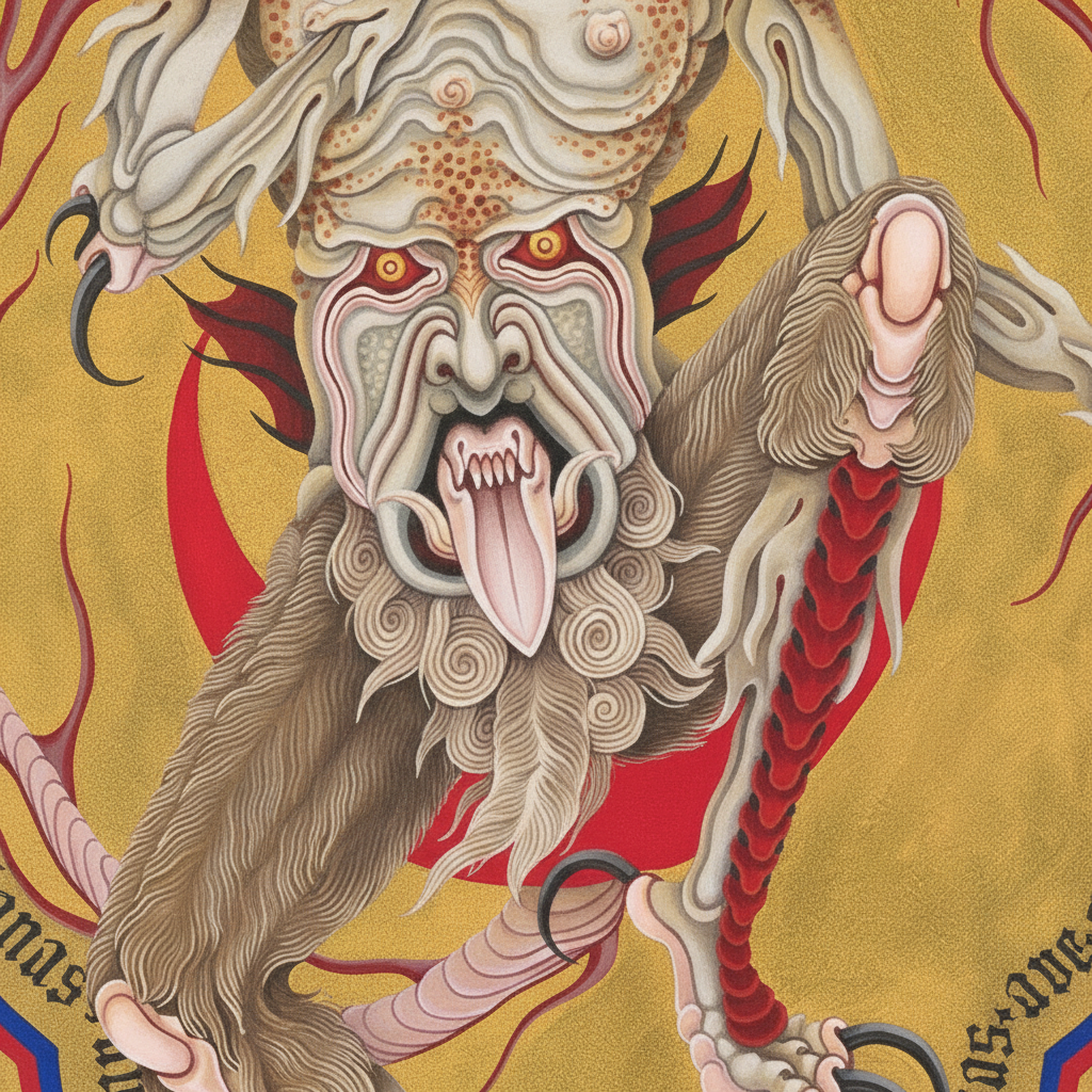 A surreal and meticulously detailed Derek Noble composition, “Hail” merges occult symbolism, mythic figures, and Noble’s unmistakable grotesque elegance. The gold background, ornate textures, and medieval-inspired framing give the piece a powerful, ceremonial presence — perfect for collectors who appreciate dark surrealism, tattoo-inspired fine art, and Noble’s legendary storytelling through linework.