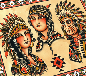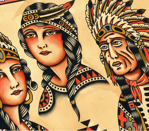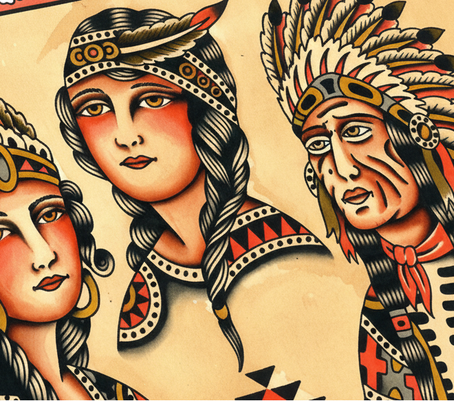A reverent homage to early American tattoo tradition, this flash sheet by Gaia Zeta features classic “local natives” imagery — a staple of vintage Western-traditional tattoo iconography.