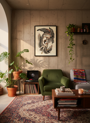 Printed in-house as a premium fine-art giclée using archival methods at Mindzai Creative on archival fine-art stock, this piece stands as both flash and fine art — a dramatic, romantic centerpiece for collectors and tattooers.