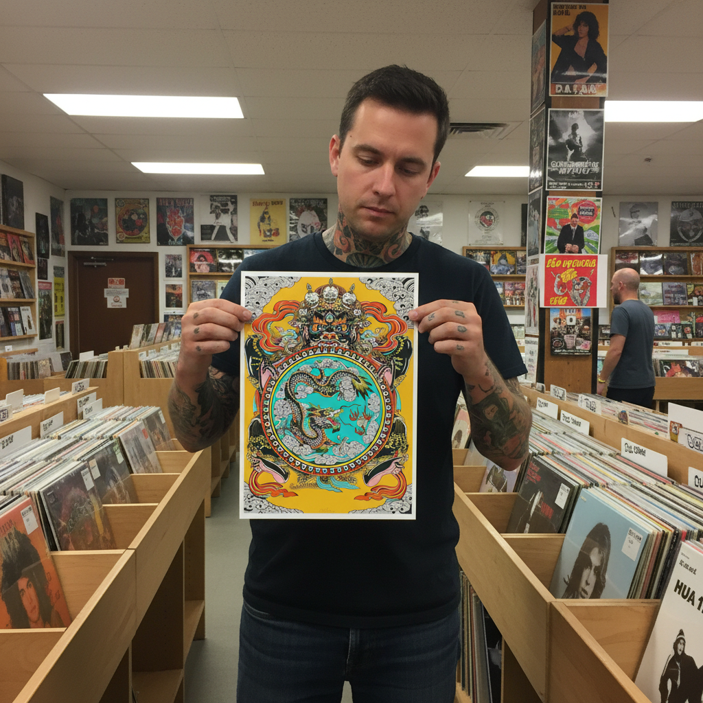 “Wheel of Life” by Lorenzo Rossi of Good Tattoo Parlour is a vibrant, highly detailed piece inspired by traditional Eastern motifs. This giclée print features bold linework, mythic symbolism, and a dynamic central dragon framed within an ornate circular design.