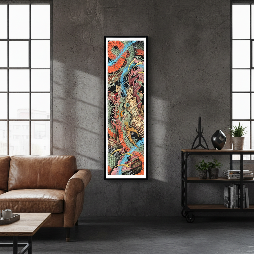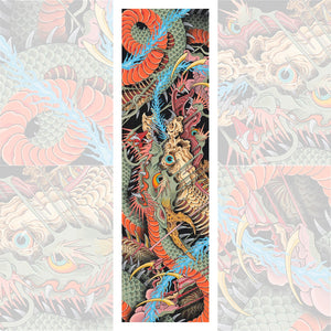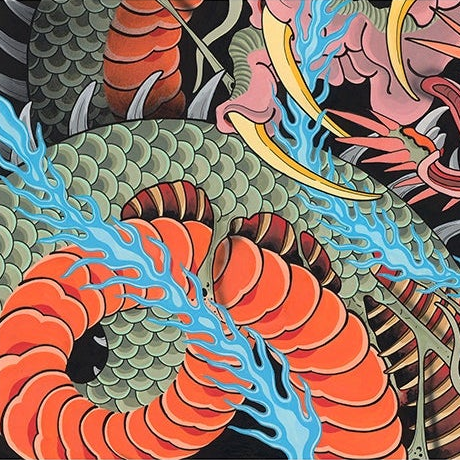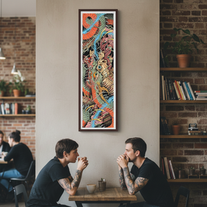 A stunning vertical composition from Stu Pagdin, “Dragon Split” showcases his unmistakable style: hyper-layered scales, explosive color shifts, and a chaotic, mythic energy that pushes traditional tattoo imagery into fine-art territory. The piece blends classic Japanese influence with Pagdin’s surreal, organic forms — every section is alive with movement and detail.