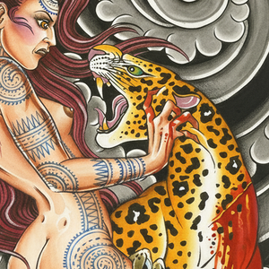 “Kitty Claws” by Valerie Vargas is a fierce and electrifying art print that merges primal energy, tattoo tradition, and mythic femininity.